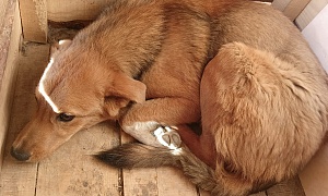отлов 26.10.2023 Горького, 9, сука кличка Пена, рыжий, 8 мес., 15.11.2023 возвращено на прежнее место обитания