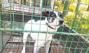 сука Чайка,Белый, черные пятна на голове,2-3 года.,отлов 23.09.2022, возврат на прежнее место обитания 13.10.2022