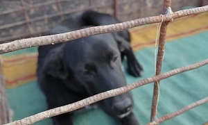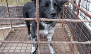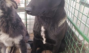сука Комба,Черный, белая полоса от носа до лба, на лапах черный крап,4-5 лет.,отлов 27.09.2022, возврат на прежнее место обитания 17.10.2022
