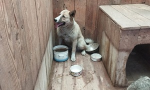 Сука Граня,белый, с черной линией на спине, кончик хвоста чёрный, 2-3 года, отлов 20.04.2022, возврат на прежнее место обитания 08.05.2022