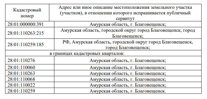 В соответствии с п. 3 ст. 39.42 Земельного кодекса Российской Федерации администрация города Благовещенска информирует о рассмотрении ходатайства АО «ДГК» об установлении публичного сервитута для размещения тепловой сети в отношении: