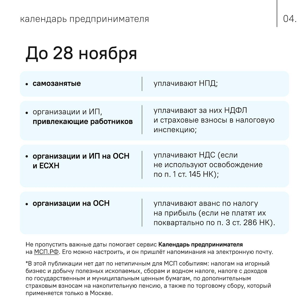 Корпорация МСП и Минэкономразвития составили ежемесячный календарь в помощь предпринимателям, который напомнит сроки сдачи отчетности, внесения обязательных взносов и уплаты налогов. Полный календарь размещён на МСП.РФ. Одна из основных задач бизнеса в первом месяце весны – отчитаться за предыдущий год и сдать налоговые декларации, по которым Налоговая служба принимает решение о включении компании в единый реестр субъектов малого и среднего предпринимательства. Если не сдать налоговую декларацию за год, то предприятие будет исключено из реестра и потеряет право на многие меры поддержки.