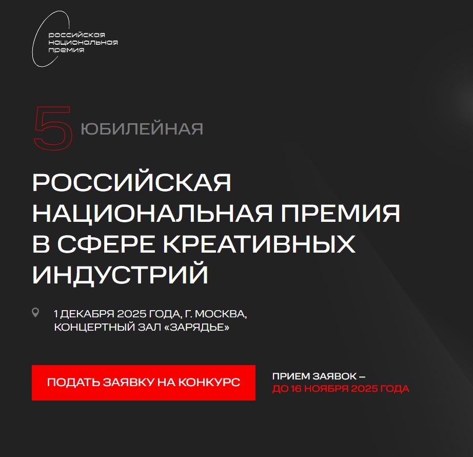 1 декабря 2025 года в МКЗ «Зарядье», г. Москва состоится церемония награждения V Российской Национальной премии в сфере креативных индустрий. Премия проводится в пятый раз и является главной наградой в сфере креативной экономики, призванной выявить лучшие регионы и города, а также наиболее успешные компании, проекты и практики, которые оказали существенное влияние на развитие данного сектора экономики Российской Федерации. Премия приобретает актуальность за счет популяризации национальных креативных индустрий, влияющих на капитализацию всех сегментов экономики.Подать заявку можно по ссылке
