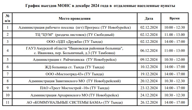 График выездов мобильного офиса налоговой службы в декабре 2024 года в отдаленные населенные пункты
