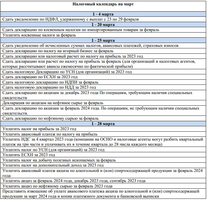 Налоговый календарь на март 2024 года