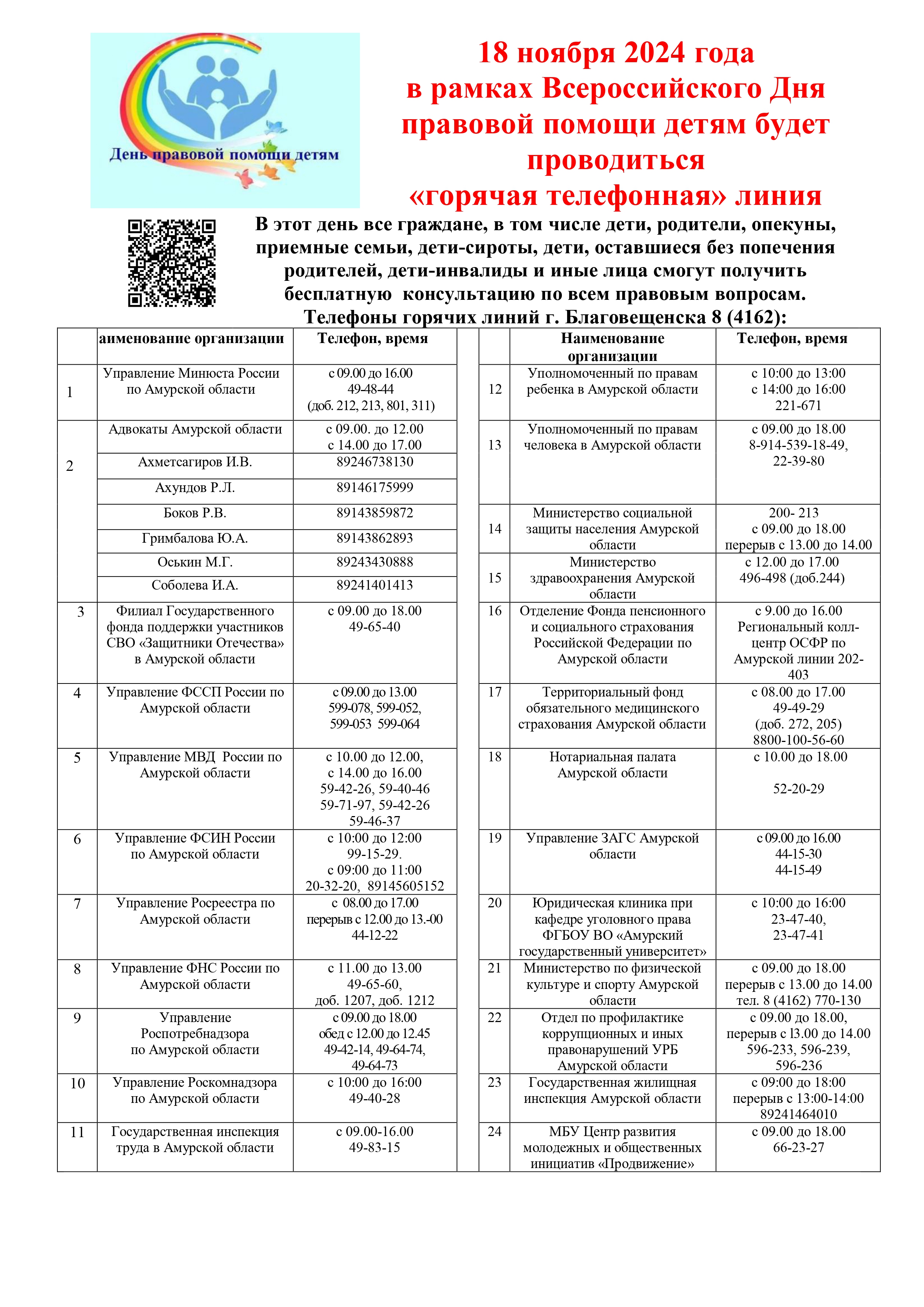 18 ноября 2024 года в рамках Всероссийского Дня правовой помощи детям будет проводиться «горячая телефонная» линия