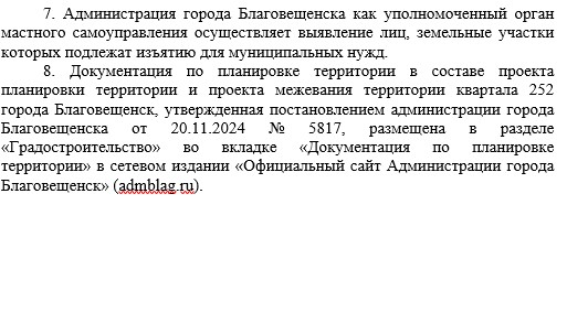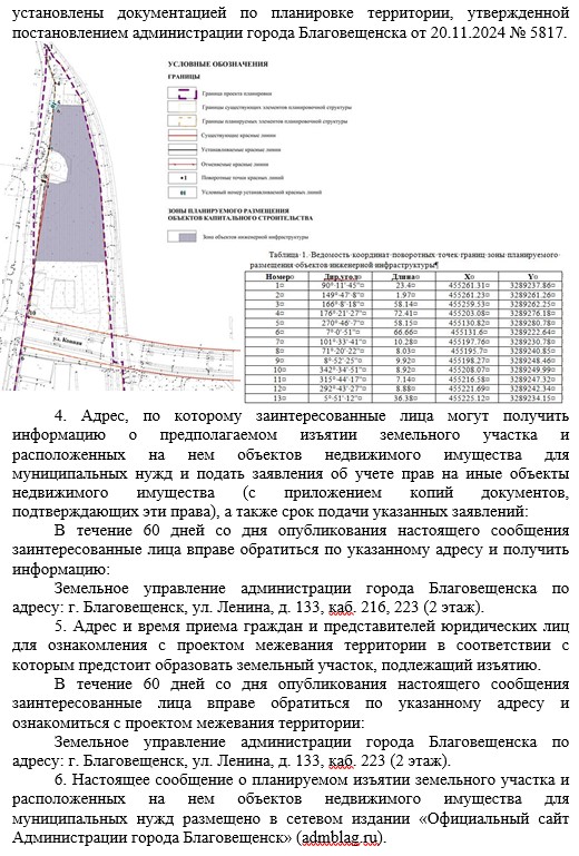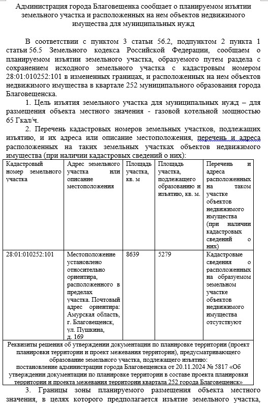 Администрация города Благовещенка сообщает о планируемом изъятии земельного участка и расположенных на нем объектов недвижимого имущества для муниципальных нужд