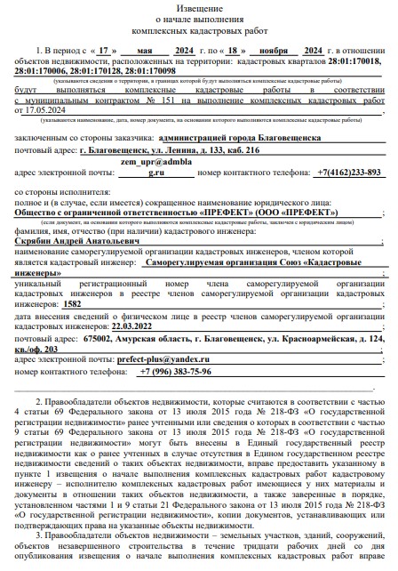 Извещение о начале выполнения комплексных кадастровых работ в период с « 17 » мая 2024 г. по « 18 » ноября 2024 г. в отношении объектов недвижимости, расположенных на территории: кадастровых кварталов 28:01:170018, 28:01:170006, 28:01:170128, 28:01:170098