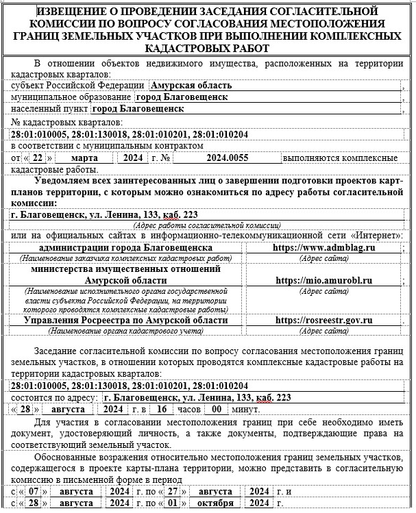 Извещение о проведении заседания согласительной комиссии по вопросу согласования местоположения границ земельных участков при выполнении комплексных кадастровых работ от 06.08.2024