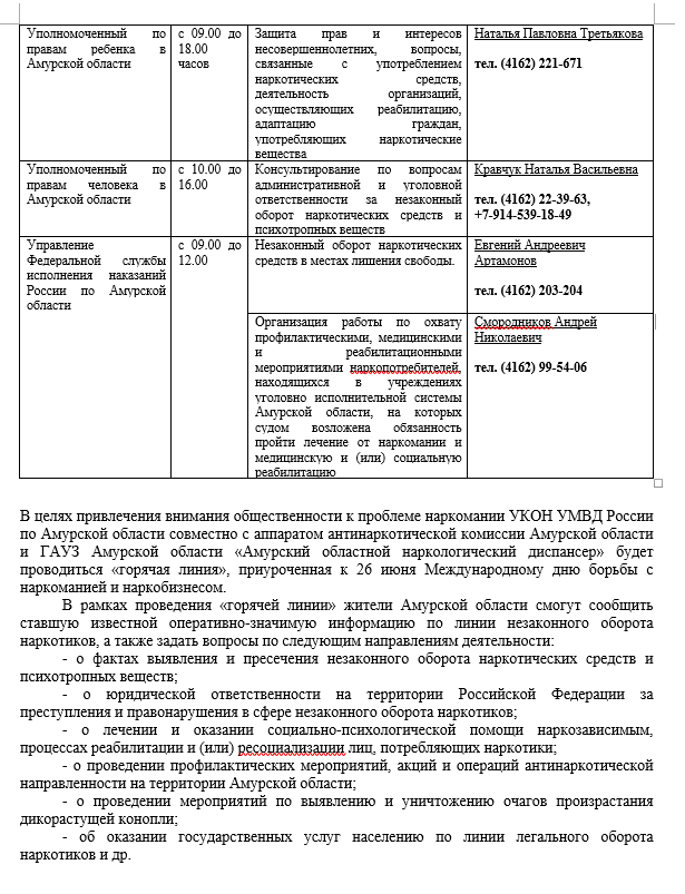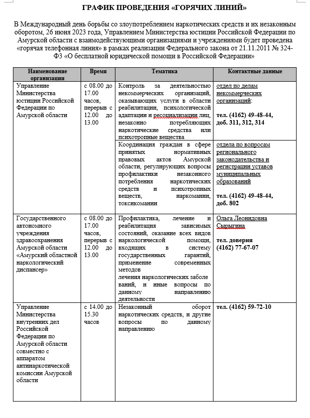 Управлением Министерства юстиции Российской Федерации по Амурской области 26.06.2023 будет проведена "горячая телефонная линия", посвященная Международному дню борьба со злоупотреблением наркотических средств и их незаконным оборотом.