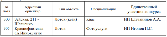В связи с тем, что на лоты подано по одной заявки, конкурс по лотам № 303, № 305 признан не состоявшимся и право на размещение нестационарного торгового объекта предоставлено единственному участнику: